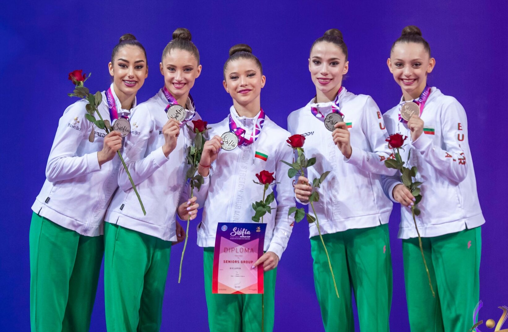 Българският ансамбъл в състав Магдалина Миневска, София Иванова, Камелия Петрова, Рейчъл Стоянов и Маргарита Василева спечели сребърен медал за съчетанието си с три ленти и две топки, с което на практика бе закрито състезанието в столичната зала “Арена София”.
