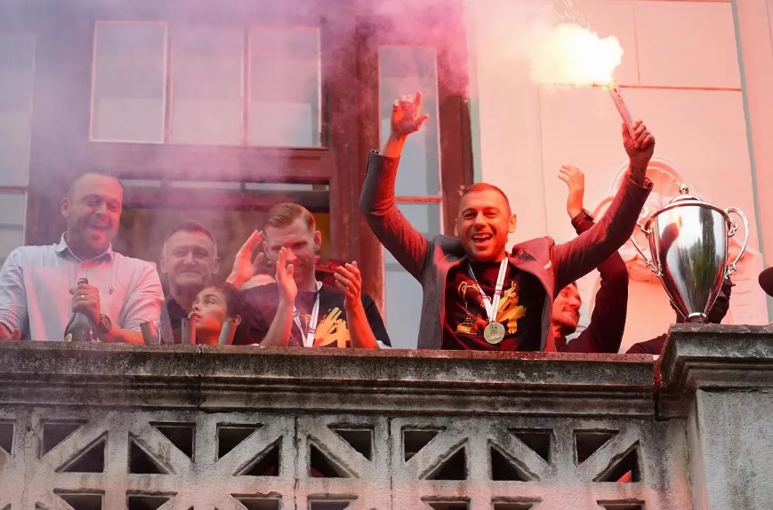 След това футболистите излязоха на прословутата тераса на Общината, където ликуваха пред хилядите си фенове, събрали се пред сградата и около жълтия фонтан, за да празнуват четвъртата Купа на България.